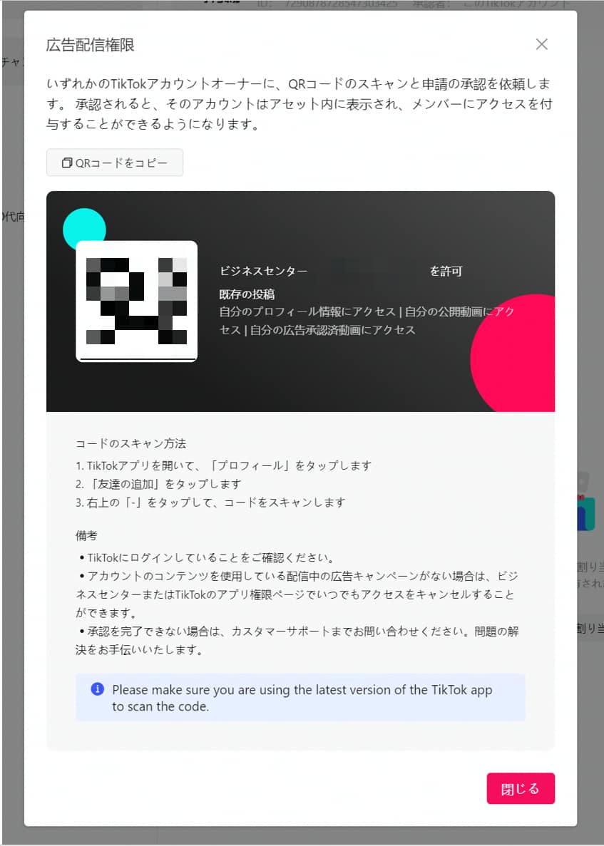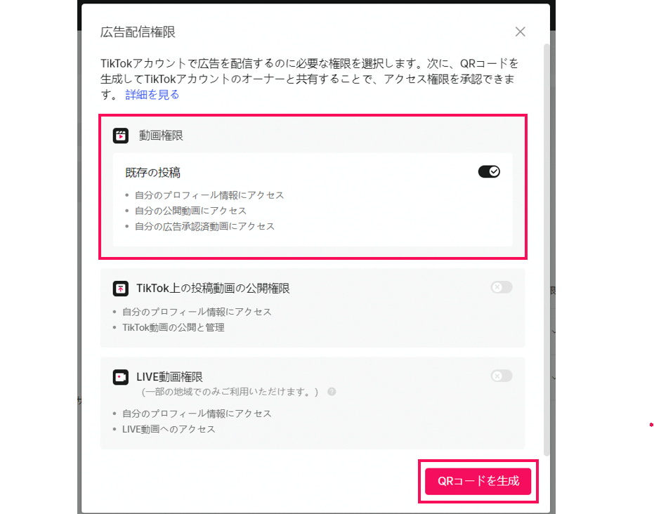 広告配信権限の選択画面が表示されるので、Spark Adsに必要な「動画権限」のトグルをオンにして[QRコードを生成]をクリックしてください。