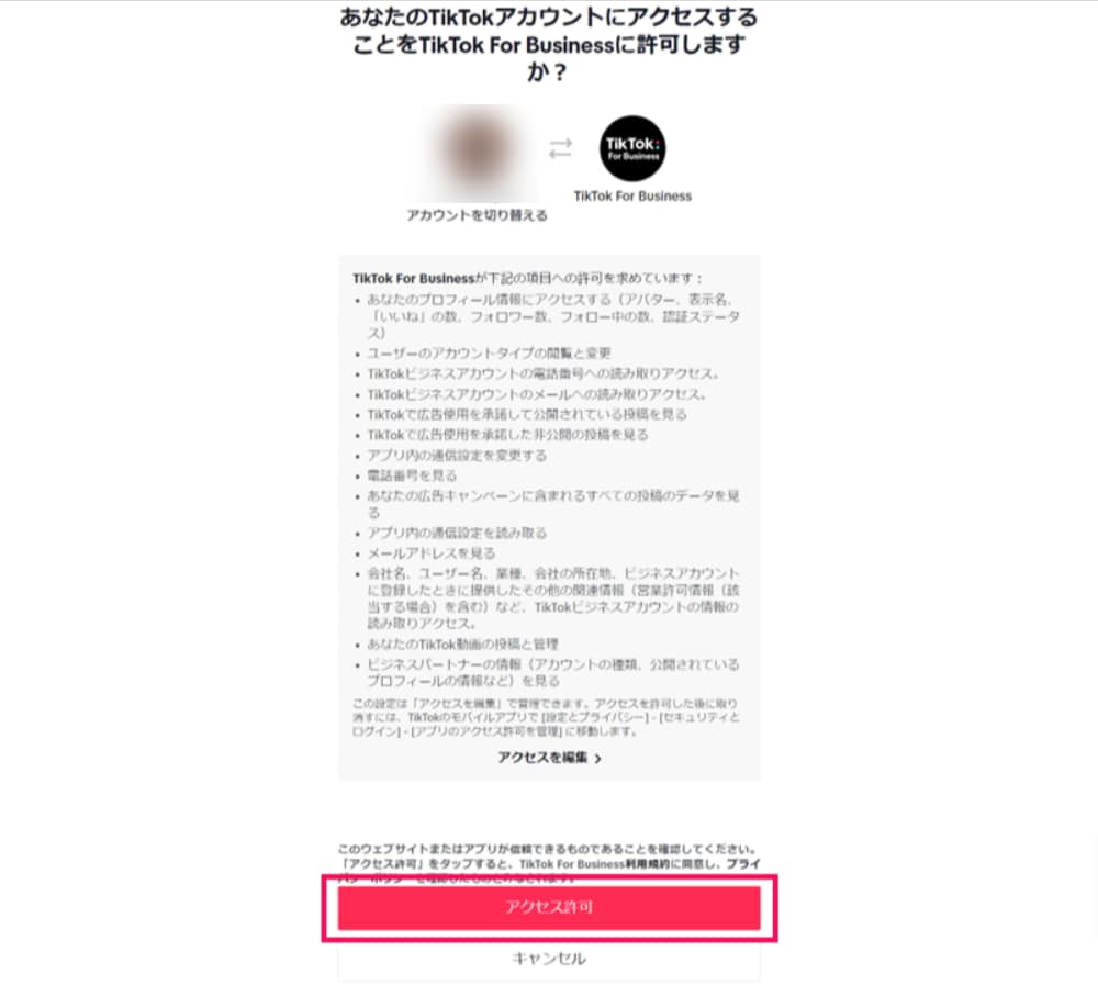 TikTokビジネスアカウントへの[アクセス許可]を求められるのでクリックします。