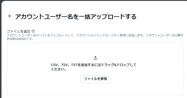 キーワード、アカウントユーザー名ともに最大2,000までアップロードが可能です。