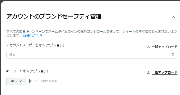 設定したキーワードやアカウントユーザー名は、画面に再度アクセスして「×」ボタンをクリックすることで解除可能です。除外に関しては現状ファイルのアップロードなどでは管理できませんので、多くの内容をアップロードする際には間違いの無いよう注意しましょう。