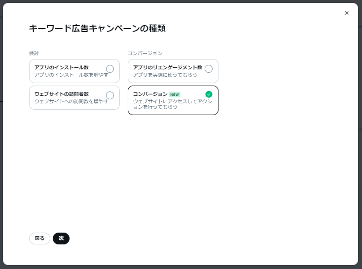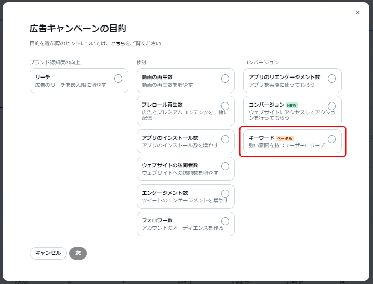 また、既存の「コンバージョン」とは別に「キーワード」をキャンペーンの目的として選択する必要があるため、専用のキャンペーンを作成する必要があります。