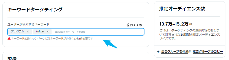 現状ではアルファベットの場合に限り大文字小文字は判別されない一方で、複数形やハッシュタグの有無は別のキーワードとして判別されるなど、配信対象となる範囲はかなり限定的です。