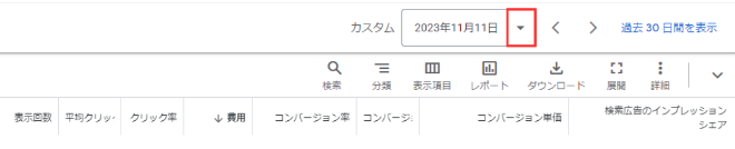 ①管理画面右上の日付から、下向き矢印を選択