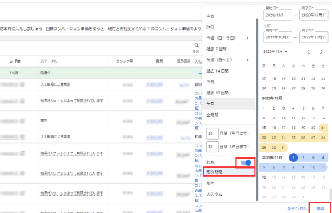 ②[比較] のスライダーをオンにして、 [前の期間] [前年][カスタム]のいずれかより比較したい期間を指定し、[適用] をクリックします。