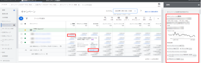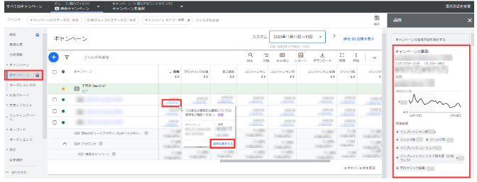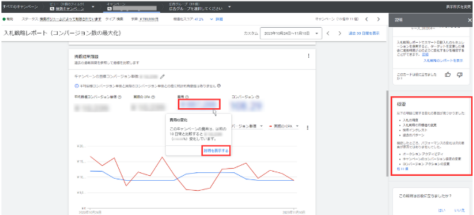入札単価や入札戦略の目標などを変更した際に、広告のパフォーマンスに影響があったかを把握できます。