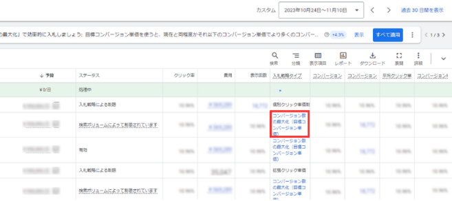 ①左側メニューから特定のキャンペーンのページに移動し、選択したキャンペーンの [入札戦略タイプ] 列のリンクをクリックします。