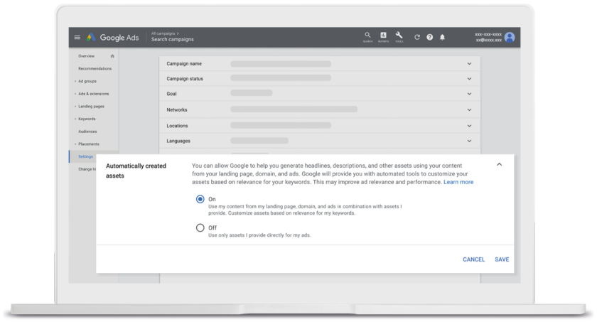 「自動作成アセット」を有効にすることで、ランディングページのコンテンツや既存の広告の内容に基づいて、見出しや説明文などのアセットが自動的に作成されます。自ら設定したものと自動的に作成されたアセットを組み合わせることで、パフォーマンスのさらなる向上を目指すものです。