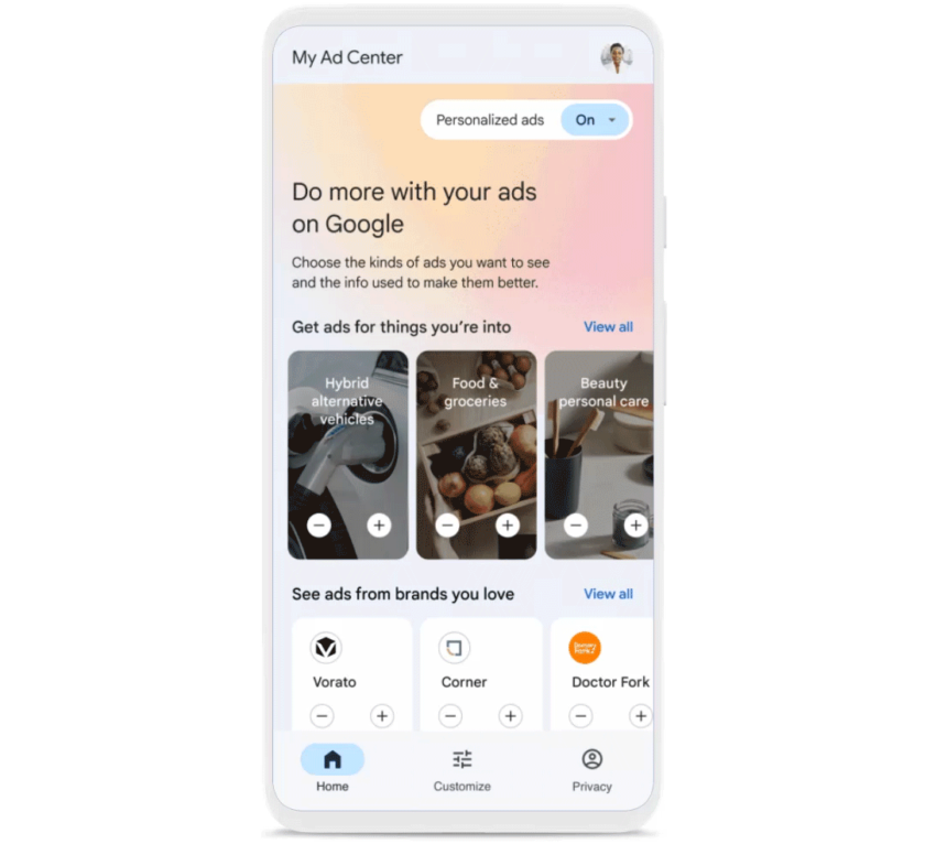広告の表示頻度の変更や広告の種類を選択することができるようになり、YouTube、検索、Discover に表示される広告についてユーザー自身のデータがどのように使用されるのかを指定できるようになります。