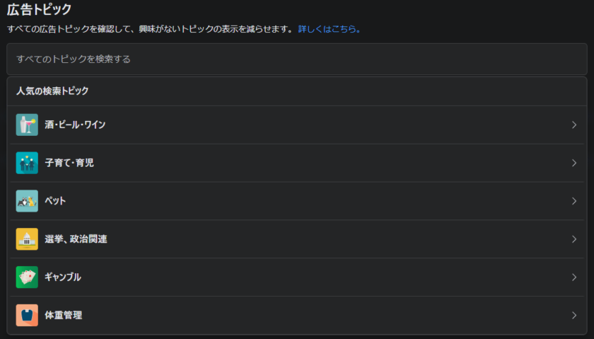 「広告トピック」と、「興味・関心のカテゴリ」の管理機能を一つに統合するアップデートが現在進められています。今回のアップデートでは「ギャンブル」や「体重管理」などを含めて、より広範囲なトピックの設定がユーザー側で設定できるようになり、「表示を減らす」を選択することで、広告主は利用者の興味関心に基づいてターゲティングをすることができなくなります。