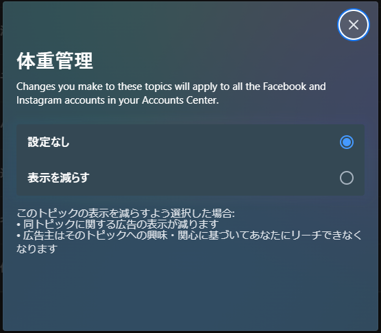 参考:Facebookで特定の広告トピックの表示を少なくするにはどうすればよいですか。| Facebook ヘルプセンター