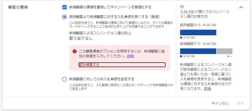- 既存顧客より新規顧客に対する入札単価を高くする(「新規顧客値」モード)