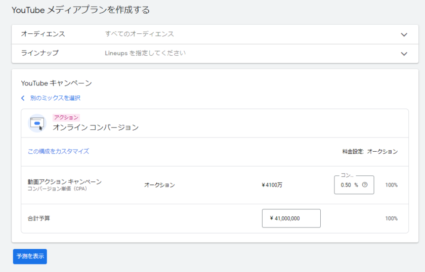 YouTube広告に取り組む際に、どのくらいのユーザーにリーチできるのかをシミュレーションしてくれるリーチプランナーですが、この度VACにも対応するようになりました。年齢や性別、オーディエンスといったターゲティングに関連する情報と合計予算、想定されるコンバージョン率を入力することで利用が可能です。