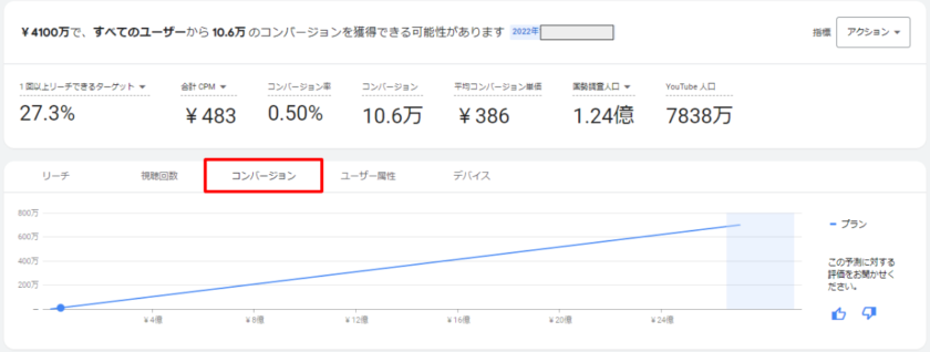 シミュレーション後のグラフには「コンバージョン」のタブが用意され、予算に対するコンバージョン数や予算に伴うリーチ数も確認が可能です。