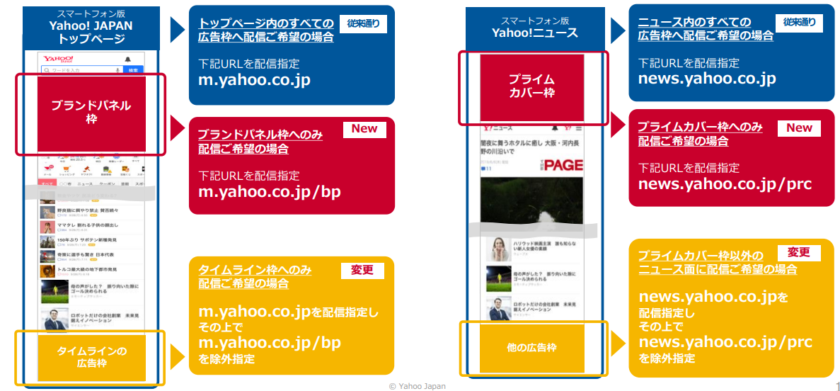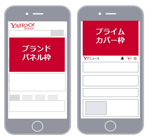 スマートフォン版ブランドパネルは、スマートフォン版(ウェブ/アプリ)のYahoo!JAPANトップページの上部掲載枠に広告を配信でき、プライムカバーはスマートフォン版(ウェブ/アプリ)のYahoo!ニュースの記事全文ページへ広告を表示できる配信面です。