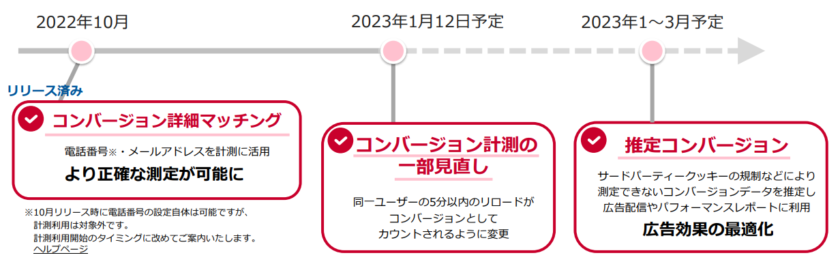 Yahoo! JAPANのプライバシー対策と他社調査により、コンバージョン計測の見直しが行われます。2023年1月12日(予定)以降は、同一ユーザーによる5分以内のリロードはコンバージョンとしてカウントされていませんでしたが、本件実施後はカウントされるようになります。