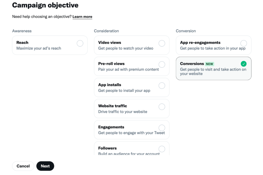 ランディングページ訪問後のアクション(「カートに追加」、「購入」、「リード獲得」、または「サブスクライバー獲得」)を設定すると、Twitterの利用者レベルアルゴリズムがより関連性の高いオーディエンスをターゲティングして、その目標を達成する可能性が高い利用者にリーチします。