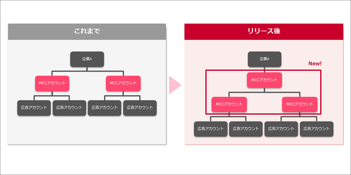 参考:Yahoo!広告 MCCアカウント 複数階層構造での設定に対応 │ Yahoo!広告 API │ Developer Center - Yahoo!広告