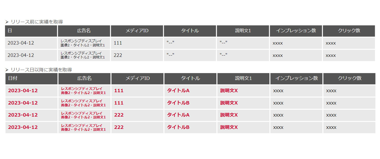 これまでレスポンシブディスプレイ広告の実績のレポート出力はメディア(画像)単位でのみ可能でしたが、今回の変更により、メディアに加えてタイトルや説明文単位のパフォーマンスも確認可能となりました。