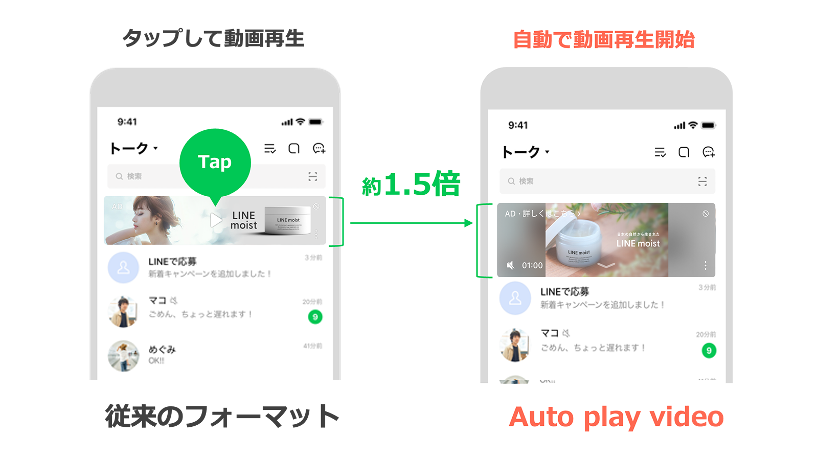 従来の広告フォーマット(「動画+静止画」や「静止画のみ」)よりも約1.5倍大きなサイズ(ミドル)で表示されるため、トークリスト上でより存在感が出ていますね。