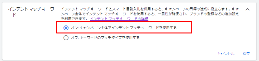 今回の名称変更と同時期に、部分一致の利用を促進する動きとして、新規でキャンペーンを作成する際、キャンペーン設定の「インテントマッチキーワードの設定」がデフォルトでオンになっています。