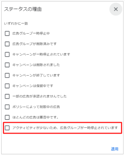 自動的に停止になる条件は、13ヶ月以上前に作成され、過去13ヶ月間表示回数が発生していない場合です。一時停止になった広告グループ・キーワードは再開することもできます。ただ、再開後3ヶ月間表示回数がない場合、再度停止されます。特定の期間だけ検索ボリュームが増えるキーワードがある場合に、意図せず掲載できていない状況になることも考えられるため注意が必要です。