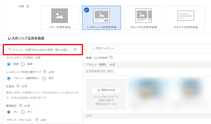 広告管理画面の「+広告作成」からレスポンシブ広告を選択、「タイトル・説明文を生成AIが提案」ボタンから利用できます。