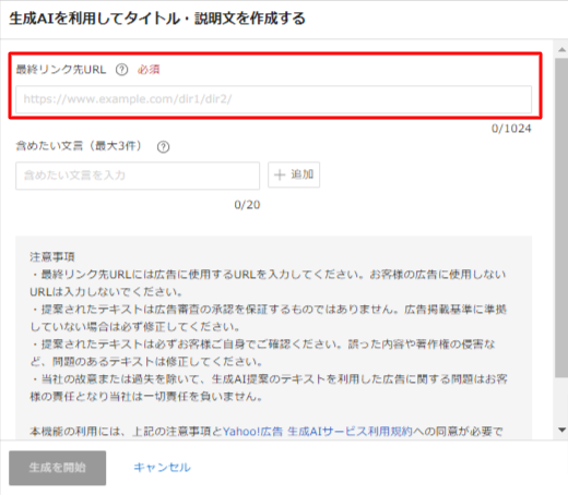 「タイトル・説明文を生成AIが提案」をクリックし、最終リンク先URLを入力します。含めたい文言がある場合、最大3件まで入力することもできます。