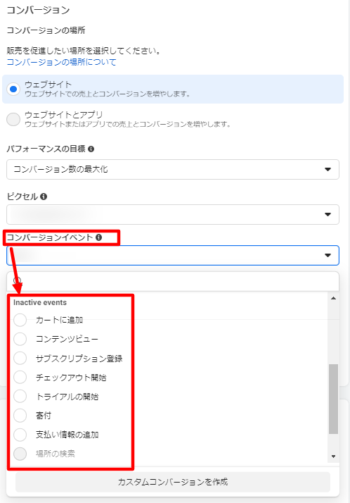 Advantage+ ショッピングキャンペーンで「カートに追加」や「支払い情報の追加」などを対象に最適化できるようになりました。利用するには、コンバージョンの場所を「ウェブサイト」「ウェブサイトとアプリ」を選択している必要があります。