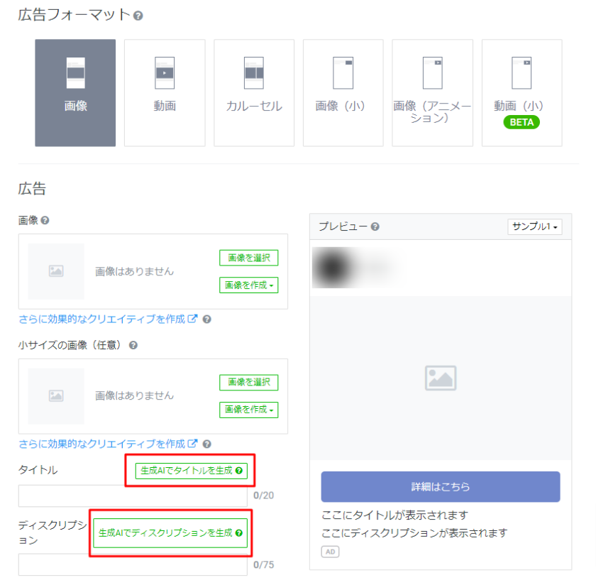 広告マネージャーから「広告を作成」で、タイトル・長いタイトル・ディスクリプションの入力欄に「生成AIでタイトルを生成」ボタンが出てきます。