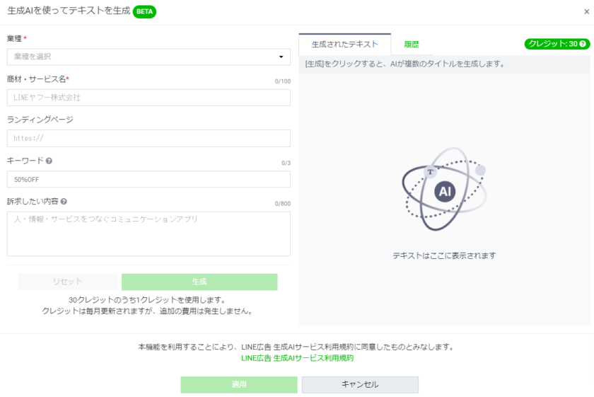 生成AIサービスを利用するためには、LINE広告 生成AIサービス利用利用規約に合意していることが条件です。また、利用上限は1アカウントあたり30回/月です。