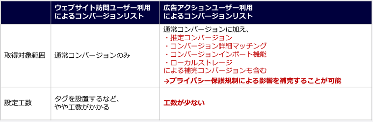 そのため、従来から使用できたウェブサイト訪問ユーザーをもとに作成するコンバージョンリストとは、コンバージョンデータの取得範囲が異なります。
