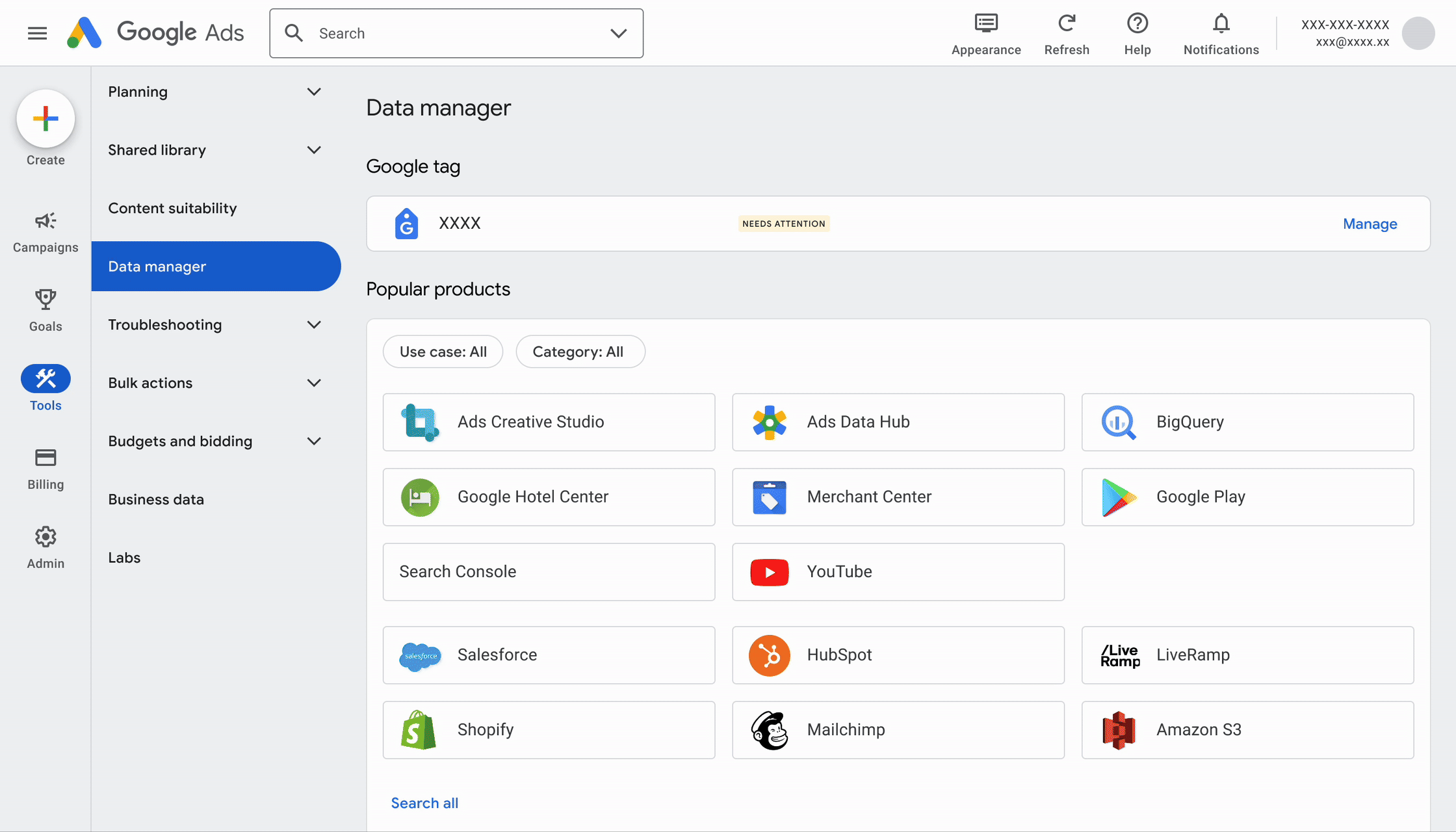 自動化ツールは、検索連動型ショッピング広告のアカウントでログインした状態で、広告管理ツール右上の「ツール」から選択できます。