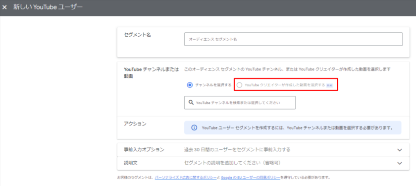 YouTubeクリエイターの動画を視聴したユーザーを基に、データセグメントを作成できるようになりました。