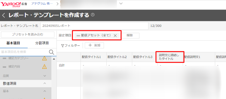 - レポート・テンプレートを作成する>基本項目で広告>「配信アセット(全て)」を選択後、「説明文に連結したタイトル」という項目を選択することで確認できます。