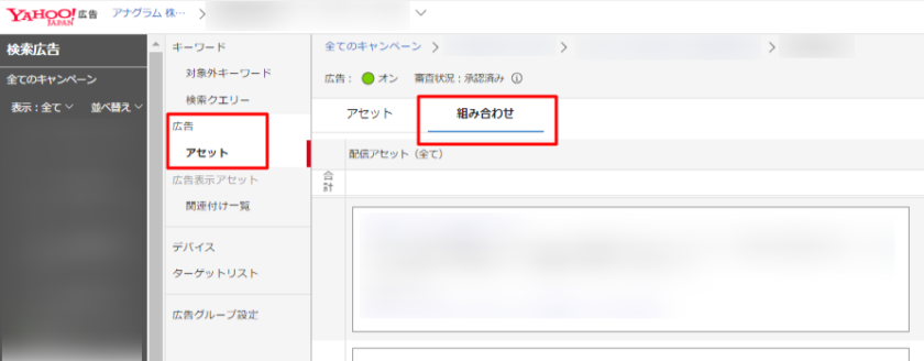 - 該当の広告グループから広告を選択>アセット詳細>組み合わせ で確認ができます。