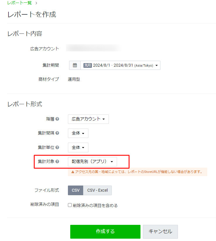 レポートの作成方法は、パフォーマンスレポートの集計対象>配信先別(アプリ)を選択し、作成をします。注意点として、アプリ単位のインプレッションが100回以上発生した場合のみ閲覧できるので、配信量が少ないと確認できない可能性もあります。