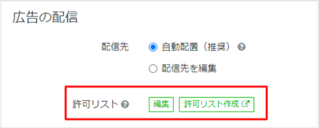 設定は広告グループ作成画面から、広告の配信設定の中にある「許可リスト」で選択可能です。