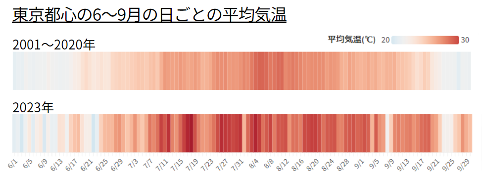 季節の変わり目は年々少しずつ変化していますが、実際にどのくらい変わっているのかを調べてみました。東京都心の6~9月の平均気温をまとめたヒートマップを見てみると、ここ20年でも大きな変化があったことがわかります。