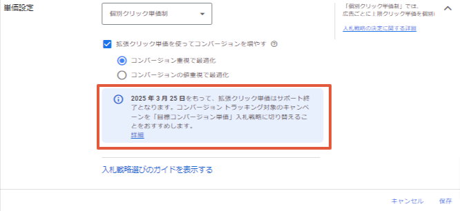 検索キャンペーンとディスプレイ キャンペーンで拡張クリック単価は、2025年3月25日以降利用できなくなると発表されました。