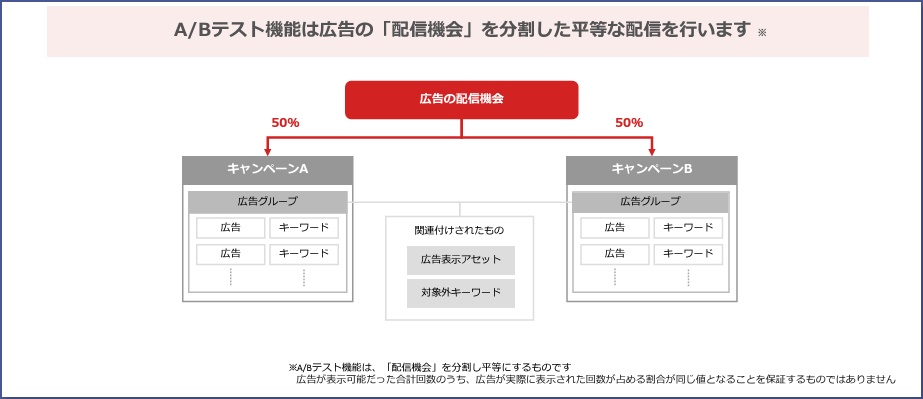 A/Bテストは、広告の配信機会を平等に分割して検証することができる機能です。同じ配信環境下でのパフォーマンス比較が可能になるため、精度高い広告効果検証ができ広告のパフォーマンス向上が期待できます。