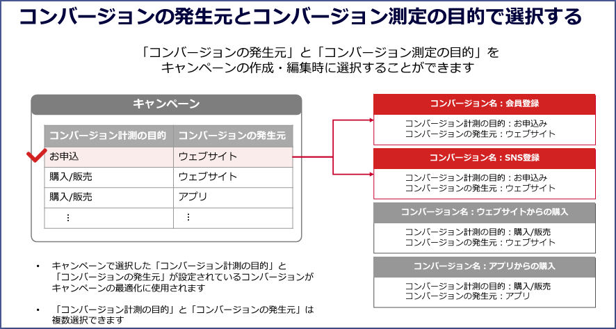 広告アカウントで達成したい目標が複数ある場合もあるでしょう。例えば、ECサイトで「会員登録」や「SNS登録」、「購入」といった複数の目標を設定している場合です。この場合、キャンペーンの目的に応じて最適化の対象を選択できるため、より個別の目標に対して柔軟な対応ができるようになります。