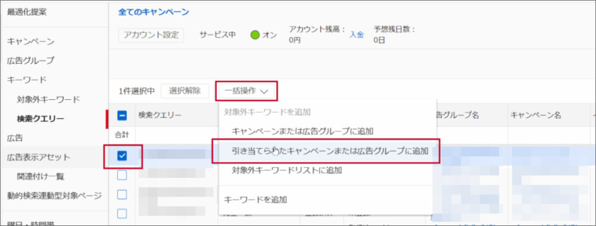 なお、特定のキャンペーンや広告グループを選択した状態だと「引き当てられたキャンペーンまたは広告グループに追加」は選択できません。