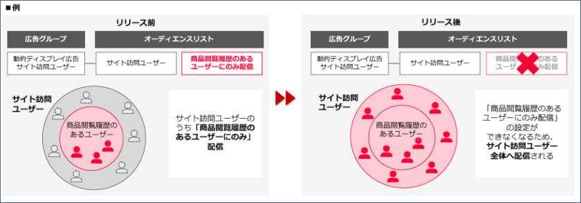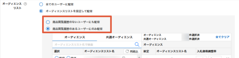 「商品閲覧履歴のあるユーザーにのみ配信」に設定している場合、提供終了以降は、自動的に「オーディエンスリストを指定して配信」になります。