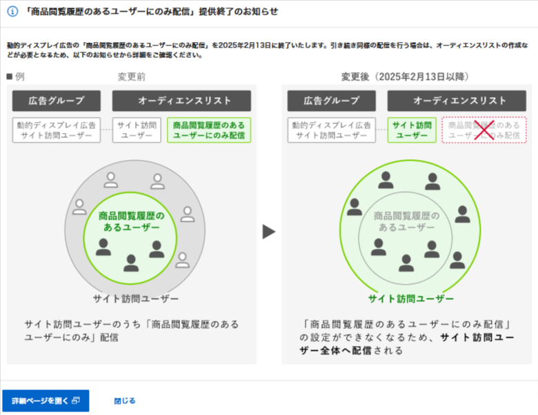 公式ヘルプ:【ディスプレイ広告(運用型)】動的ディスプレイ広告 「商品閲覧履歴のあるユーザーにのみ配信」の提供終了について - LINEヤフー for Business