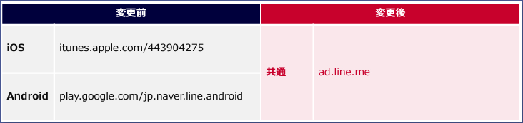 LINEアプリのプレイスメントURLが、OS共通のURLに統一されました。これまではOSごとに異なるURLを指定する必要がありましたが、変更により1つのURLで対応可能になるため、登録漏れのリスクも軽減されます。