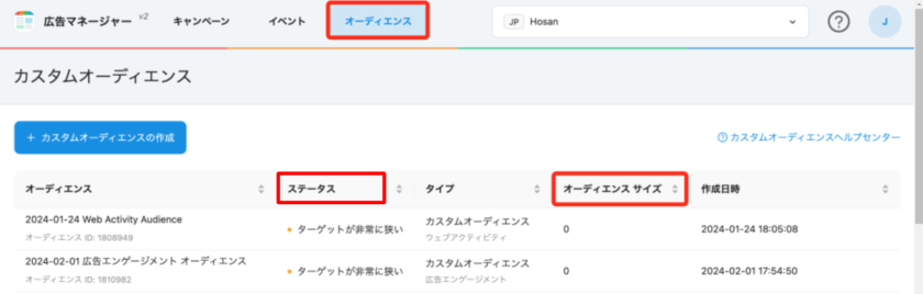 カスタムオーディエンスのサイズ・ステータスが表示されるように