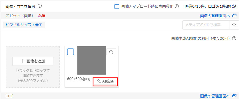 広告の新規作成または編集時の画面に表示される登録済み画像に、「AI拡張」ボタンが画像右下に出ています。それをクリックすると、「注意事項」がでますので同意のできる場合「生成を開始」に進みます。