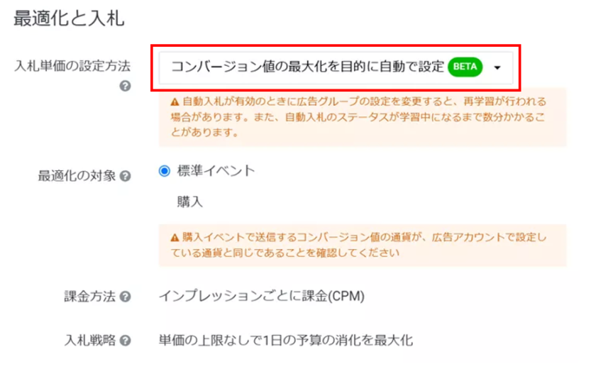 今までは「コンバージョン数の最大化を目的に自動で設定」「クリック数の最大化を目的に自動で設定」の2パターンの入札方法だったので、コンバージョン値の最大化が選択できることによって、より広告の目的にあった配信が可能になるでしょう。