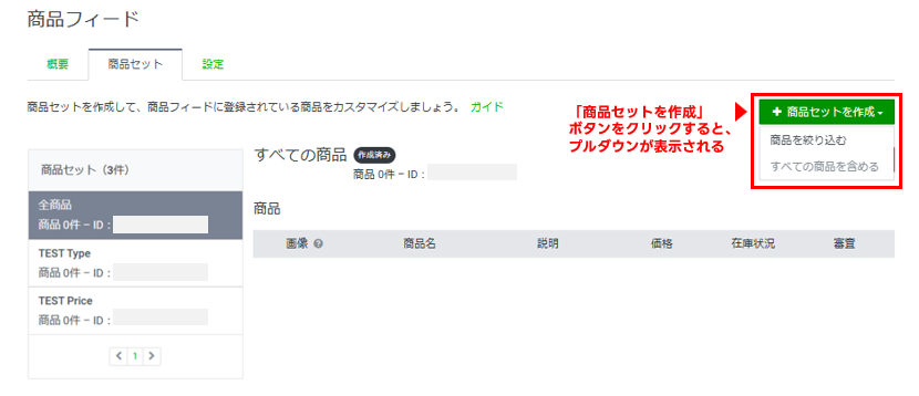 広告管理画面の商品フィード作成画面で、「商品セット作成」ボタンをクリックすると、プルダウンが表示され「すべての商品を含める」が選択できるようになりました。