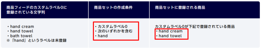 いままでは、商品フィードの「カスタムラベル・商材タイプに登録されているワード」に限定されていましたが、これからは、「カスタムラベル・商材対応に登録されていない文字列でも条件設定ができる」ようになります。